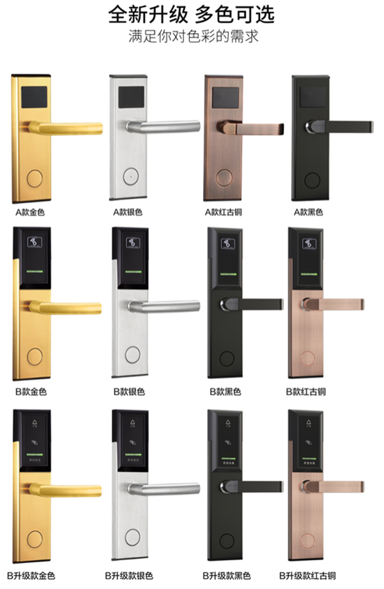 酒店锁(Hotel lock)按其原理为RFID智能感应锁,为有源电子感应锁是电子锁的其中一部分系列产品,酒店锁主要用于商用批量使用,以安全、简单、稳定、可靠,价格便宜等为主要特点。主要通过ID或IC感应卡进行开门取电开门,控制楼层电梯等功能,而不同于其它电子锁如指纹锁,密码锁、蓝牙APP、2.4G、人脸识别锁等主要用于家用电子门锁,要求多种开门方式并存,方便开启;而酒店电子门锁者则要求单一或较小的开门方式选择,这样有利于管理的实现。酒店锁由以前的机械锁发展到电子感应门锁,现的由电子感应门锁配备酒店管理系统,实现酒店智能化管理。是目前最为流行的一种电子门锁。